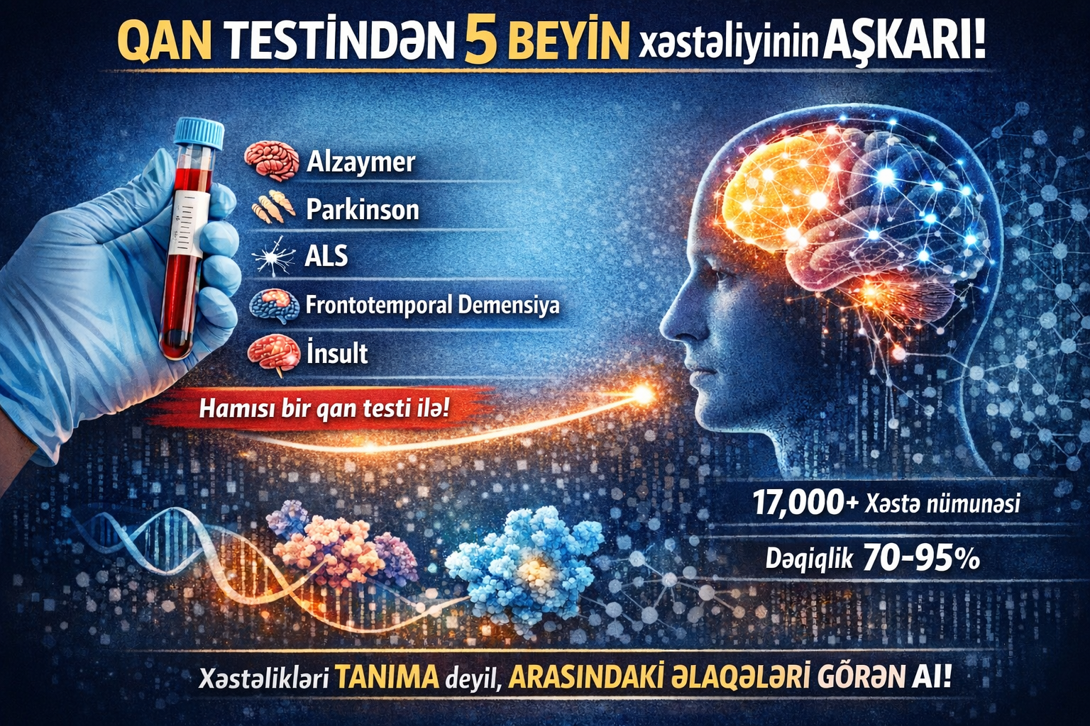 Düşünün: bu gün ixtisaslaşmış klinikada belə hər 3-4 xəstədən biri səhv diaqnoz alır. Adi klinikada bu rəqəm 50%-i keçir. Çünki bu xəstəliklərin simptomu bir-birinə o qədər oxşardır ki, ən təcrübəli həkim belə yanıla bilər. ProtAIDe-Dx adlanan bu model fərqli bir yol tutub. 17.000-dən artıq xəstənin qan zülallarını analiz edib, beyin degenerasiyasına aid ümumi bir protein “imzası” tapıb. Bu imzanı öyrənib — sonra ondan 5 xəstəliyi eyni anda, eyni nümunədən müəyyən edib. Dəqiqlik? 70-95% aralığında, çoxsaylı müstəqil verilənlər bazasında sınaqdan keçirilib. Niyə bu, AI üçün mənim maraqlandığım bir nöqtədir? Çünki bu, AI-ın “xəstəliyi tanıma” deyil, “xəstəliklərin arasındakı gizli əlaqəni görme” qabiliyyətinin nümayişidir. Birinin nə etdiyini deyil — necə bir-birinə bağlı olduğunu anlama.