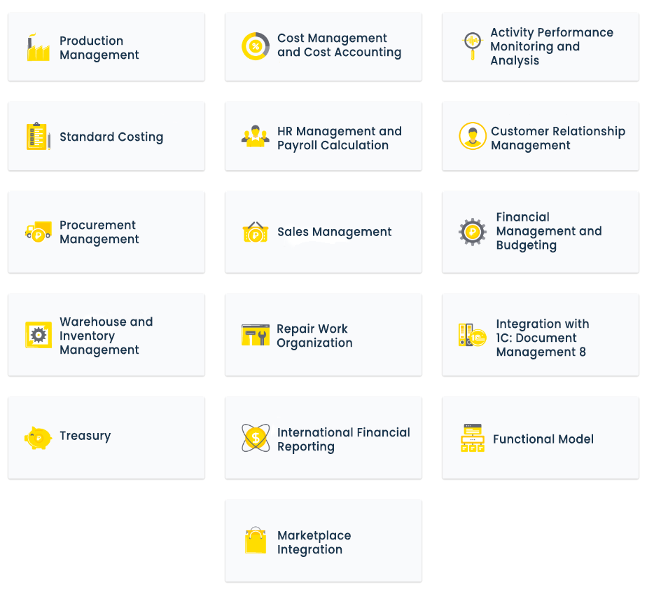 “1C: ERP Enterprise Management” is applied across a wide range of industries. In manufacturing, construction, agriculture, energy, logistics, the food industry, and other sectors, the following benefits can be achieved with the help of this system: