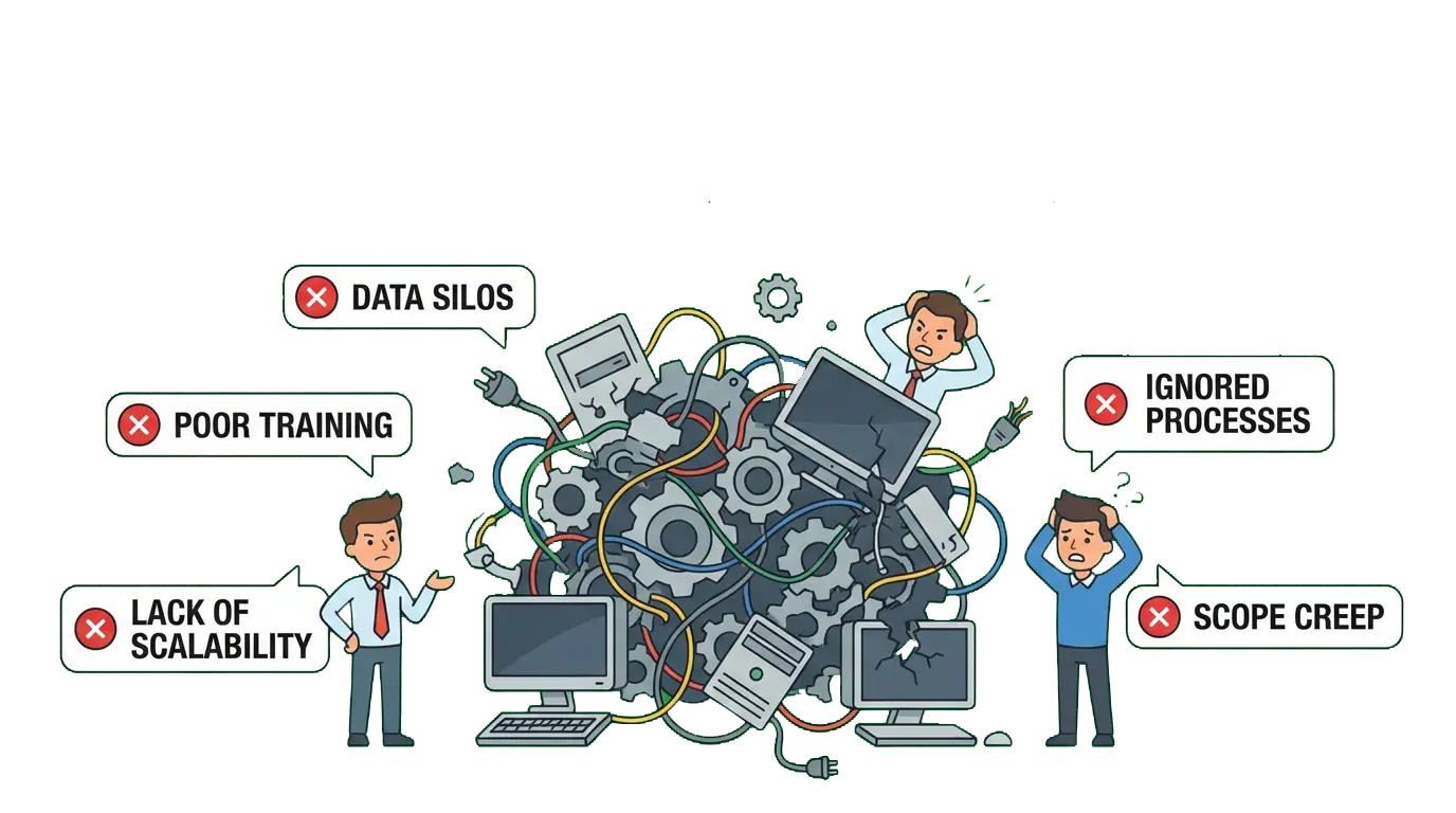 Хотя ERP-проекты открывают большие возможности, ошибки на этапах планирования и реализации могут привести к провалу. Например, неправильный анализ предложений или недостаточная подготовка команды ведут к задержкам проекта и росту затрат. Теперь давайте пошагово рассмотрим, какие ошибки в ERP-системах встречаются чаще всего и как их избежать.